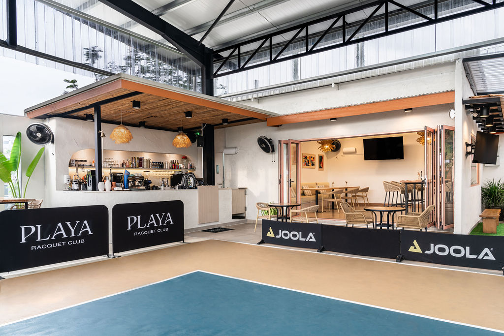 Earthy tones of sandy beige, textured walls, and tropical elements bring about a curated experience of a boutique pickleball club. The use of bamboo and woven furniture evokes a warm, natural, and organic ambiance that is juxtaposed with the view of skyscrapers and the greenery of the Royal Selangor Golf Club. Guests are transported to a beach-inspired escape in the heart of the city as they enjoy an exciting game of pickleball.